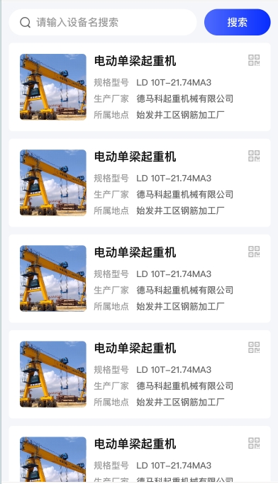 系統(tǒng)主要管理特種設(shè)備的名稱、型號、設(shè)備種類、所屬特種設(shè)備組、設(shè)備編號/車牌號、合同編號、數(shù)量、金額、進場時間、出場時間、合格證、檢測報告、是否臨時設(shè)備、司機姓名、司機聯(lián)系方式、設(shè)備內(nèi)控二維碼。